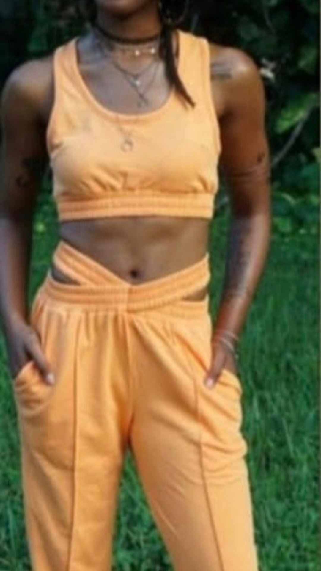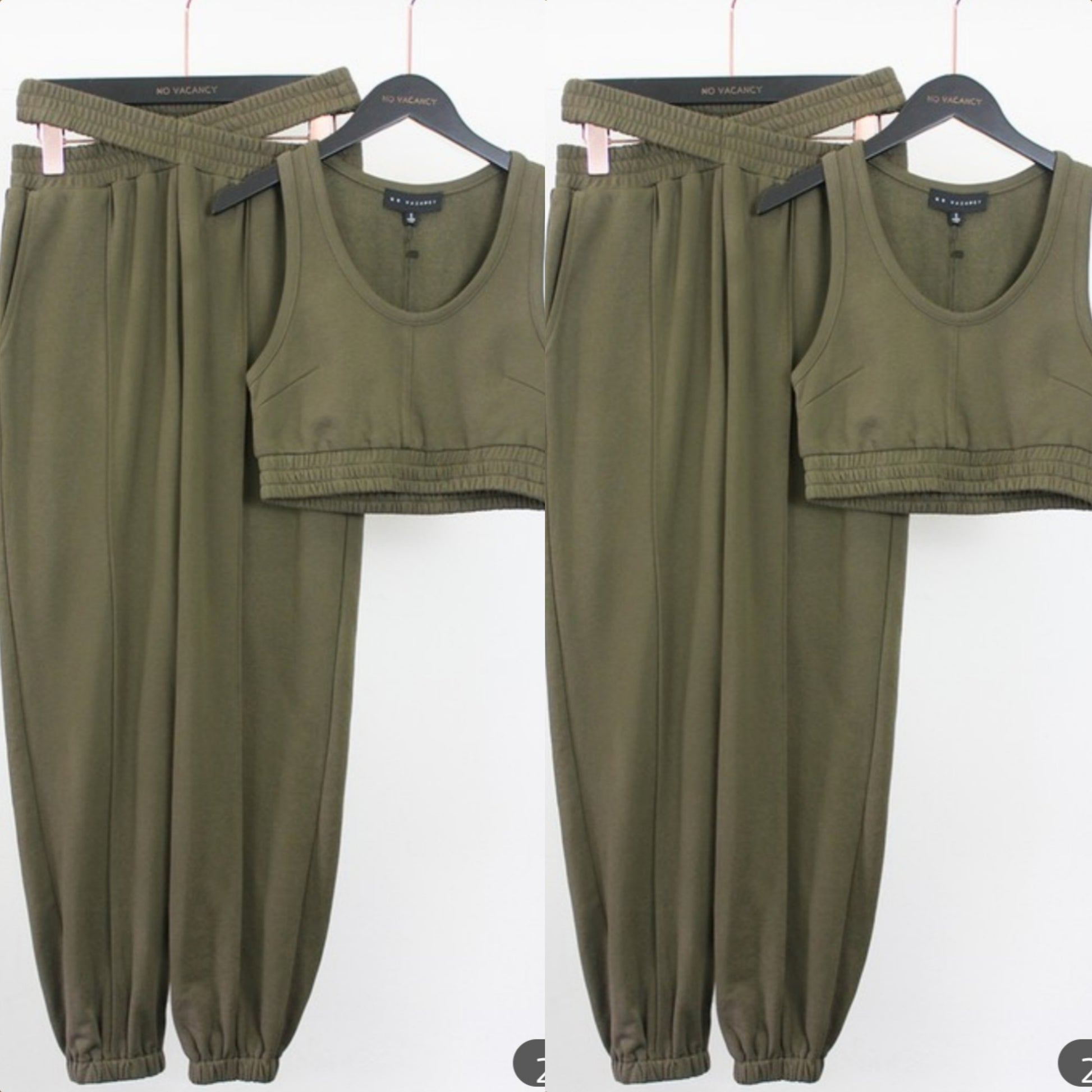 Stay stylishly comfy in the "Simone" Jogger Set in Olive. This playful duo features joggers perfectly paired with a cropped top that flaunts a chic crossed waistband, adding a fun twist to your casual look.